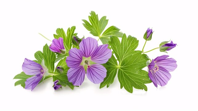 5. Wood cranesbill (Geranium sylvaticum) in full bloom with vibrant purple flowers and intricately shaped leaves, isolated on a white background, showcasing its detailed botanical features