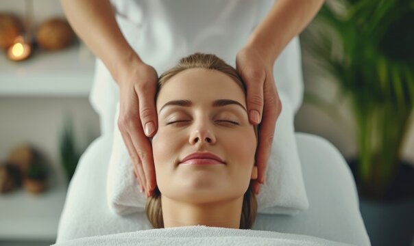 Female energy massage relaxing and care treatment for body and mindfull health gentle woman arms holding head doing access bars and face young procedure.