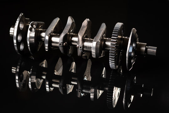 high performance racing motorcycle crankshaft on a reflective black background. lit with a flash for different affects.