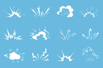 Cartoon bomb explosion, comic clouds boom blasts with bang smoke, vector explode icons. Cartoon comic bomb explosion or explosive blast cloud effects of TNT dynamite burst or fight crash flash