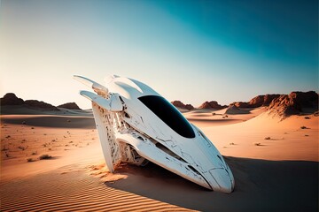 A huge alien ship crashed in the desert. AI generative.