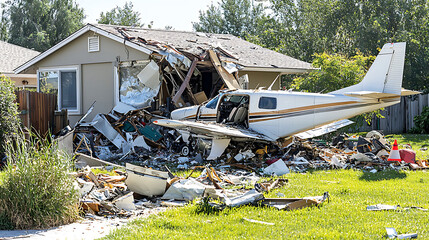 Small plane crashed into a house causing significant damage to the home's facade and scattering debris across the lawn.
