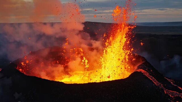 Active volcano crater with dramatic lava fountains and molten rock eruption against evening sky creating spectacular natural fireworks display