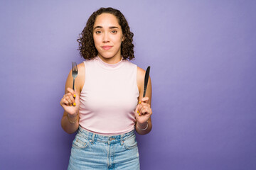 Young woman with cravings ready to eat lunch and making eye contact
