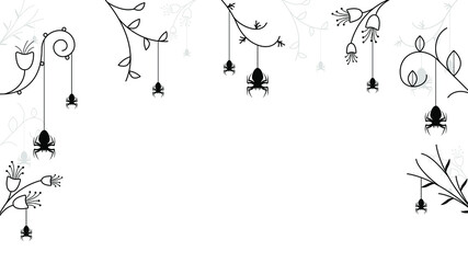 Spiders on Web with Branch Plants Botanic white Background. Halloween Background Design Element. Spooky, Scary Horror Decoration Vector