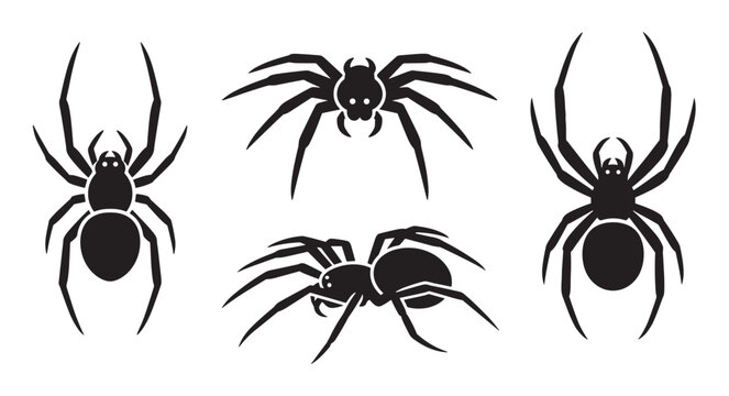 Four black spider silhouettes in a graphic vector style for Halloween decorations or scary design elements, showing different creepy crawly arachnid shapes from a top-down view