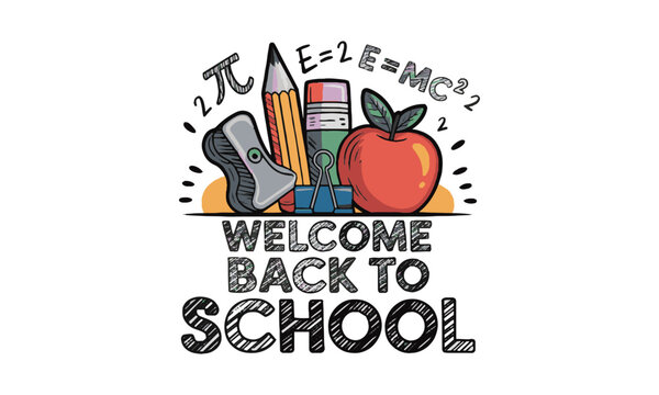 Scalable modern vector illustration based on a welcome back-to-school theme, Welcome Back to school horizontal banner, doodle on checkered paper background, easily editable.