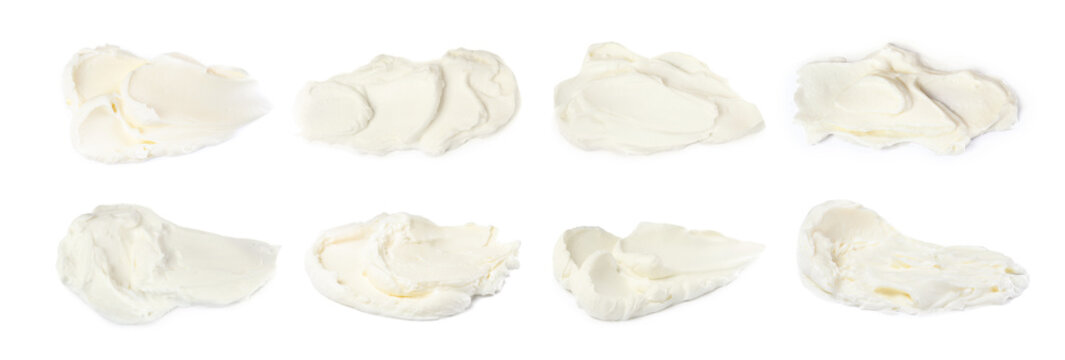 Close up view of a rectangular smear of white cream cheese against a solid black background space filling