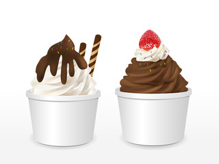 Strawberry and chocolate sundae ice cream cup and wafer isolated on white background