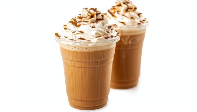 Pumpkin latte with whipped cream and cinnamon in a takeaway cup on white background