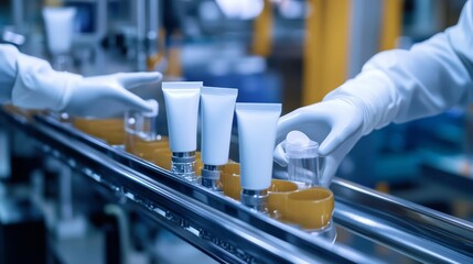 A factory makes beauty products.  They're shown packaging hand cream into metal tubes.