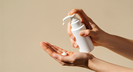 Woman hands holding a white dispenser and pouring moisturizing body lotion on her palm on a beige background