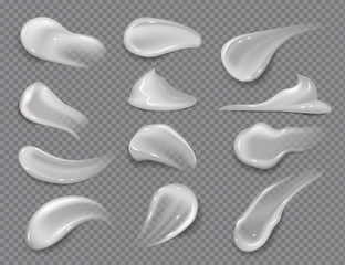 Cream smears. Realistic white cosmetic gel, creamy toothpaste blobs on transparent background. Vector skincare lotion set
