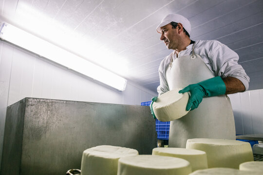 A woman working in a small family creamery is processing the final steps of making a cheese. Italian hard cheese silano or caciocavallo, mozzarella