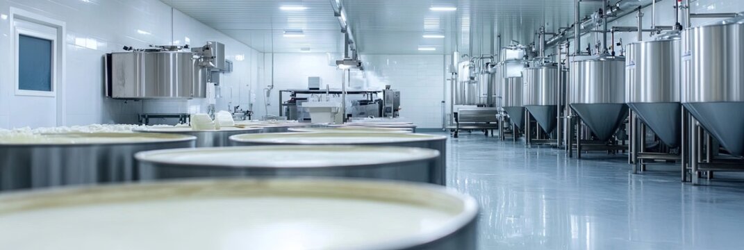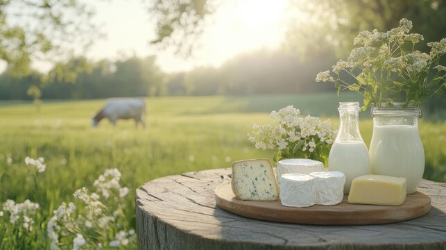 Dairy delight: wooden table adorned with cheese, milk, cream, set against picturesque backdrop of green meadows, bright sunlight, featuring grazing cow, embodying freshness, healthy farm produce.