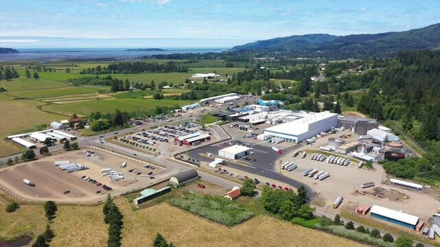 4K aerial drone video of Tillamook’s famous creamery factory on the Oregon coast, featuring large parking areas, surrounding roads, forested hills, and semi-trucks during a summer afternoon