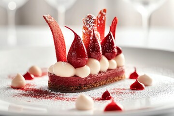 A gourmet dessert featuring a red velvet cake base, topped with creamy white frosting, red fruit, and garnished with powdered sugar and red glaze.