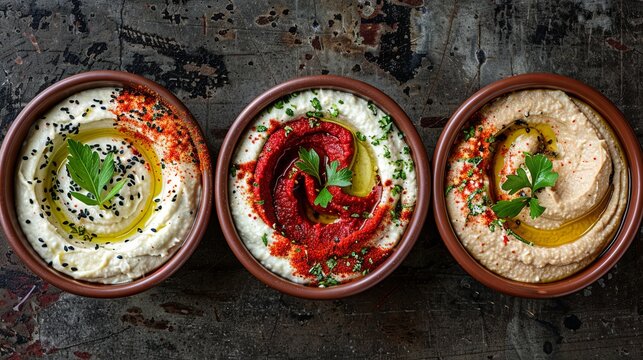 Vibrant trio of hummus dips in ceramic bowls on rustic background
