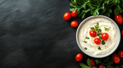 A delightful presentation of a creamy dip surrounded by vibrant cherry tomatoes and fresh herbs, perfectly enhancing its appetizing nature for any culinary experience.