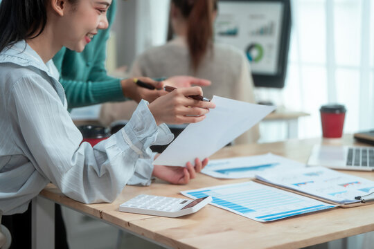 Three Asian women collaborate at shared office desk filled with documents, charts, coffee. One leads the discussion, another points at data, third listens attentively, showing productive teamwork.
