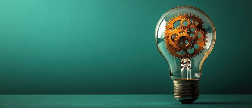 Illustration light bulb surrounded by gears. Symbolizes innovation driving business. Creative design, teamwork, digital transformation, problem solving, brainstorming new ideas.
