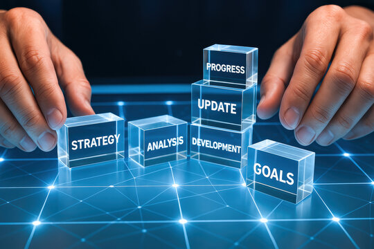 This depicts a business strategy analysis involving transparent blocks labeled with goals progress and development illustrating a systematic approach to planning
