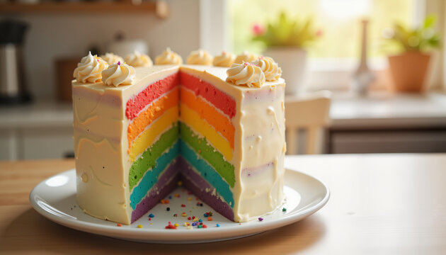 Colorful rainbow cake in cozy kitchen setting, celebrating Pride Month