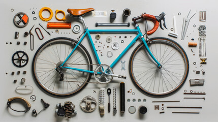 Top view of bicycle and parts of it. Bicycle and parts to it, layout. Beautiful illustration picture. Generative AI