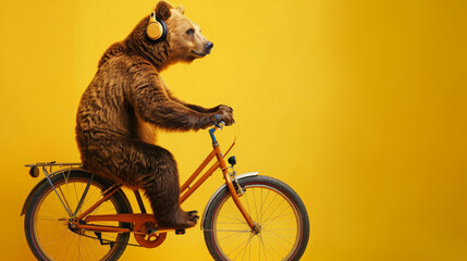 A bear on an orange bike with headphones against a yellow background,free space for text