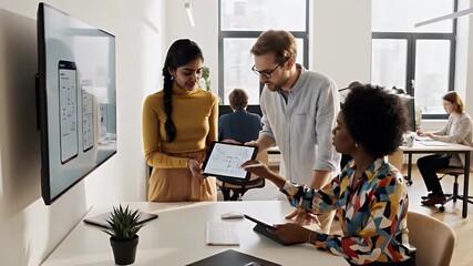Diverse team engaged in creative idea exchange in office setting