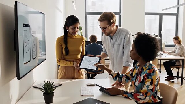 Creative team brainstorming session in a modern office Discussing strategies and ideas on a whiteboard Fostering innovation and teamwork