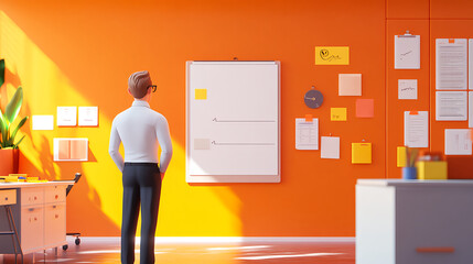 A man stands in front of a whiteboard filled with notes and sketches, engaging in a brainstorming session in a contemporary office environment, fostering creativity and collaboration.