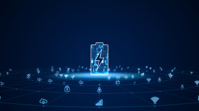 Blue digital battery LOGO with line connection and data transfer to futuristic icon technology abstract background