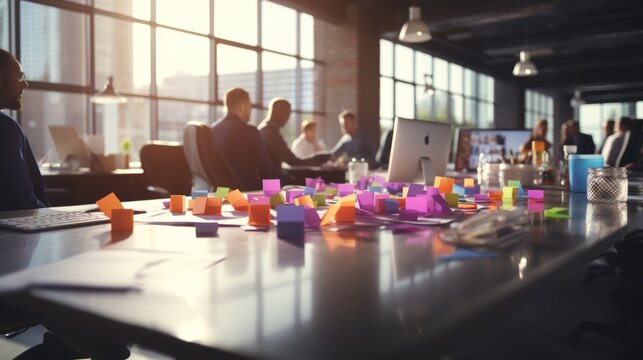 Team collaboration during creative meeting with sticky notes on table in blurred background