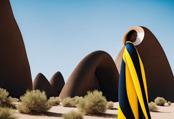 Generative AI illustration portrait of African American female fashion model in blue and yellow futuristic clothes and hood looking at camera