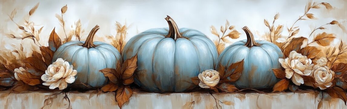Watercolor White and Blue Pumpkins with Delicate Leaves and Flowers