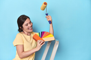 Man working with colorful paint samples for art project, artist creating color palette inspiration
