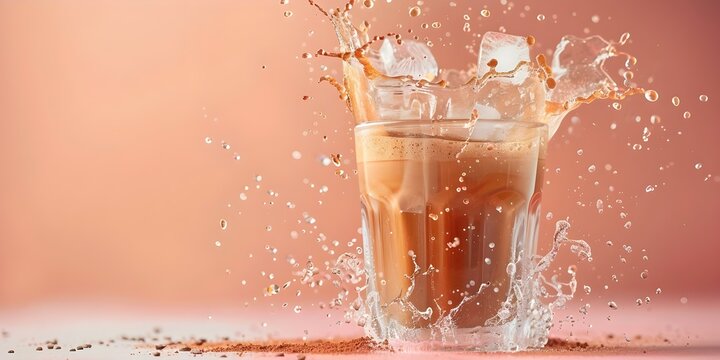 Studio banner with glass of cappuccino splashing ice on pastel gradient background. Concept Food & Drink Photography, Coffee Art, Cappuccino Splash, Pastel Gradient, Studio Shoot