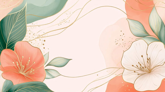 Elegant watercolor floral design with soft pink and peach flowers and abstract line art, Luxury minimal style wallpaper with golden line art flower and botanical leaves. Watercolor background