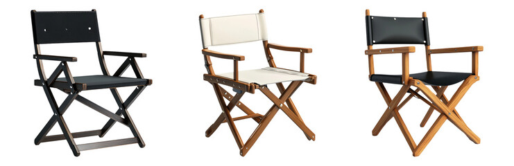 Set of three different director chairs isolated on transparent background wooden and fabric chairs for cinema and studio use