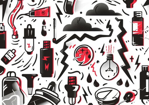 Abstract doodle art with eyes and objects. A monochromatic doodle art style image, featuring eyes, light bulbs, syringes, and various abstract shapes