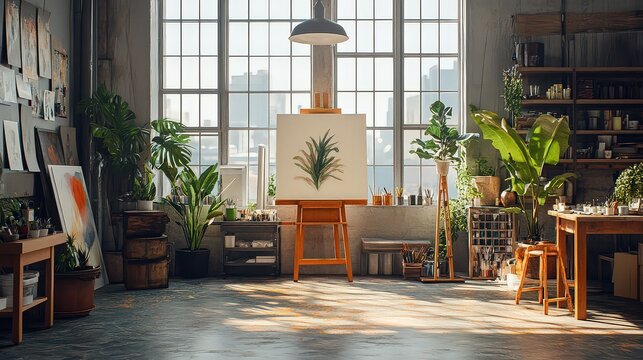 loft transformed into a creative studio, with art supplies, an easel, and large windows providing natural light for artistic endeavors