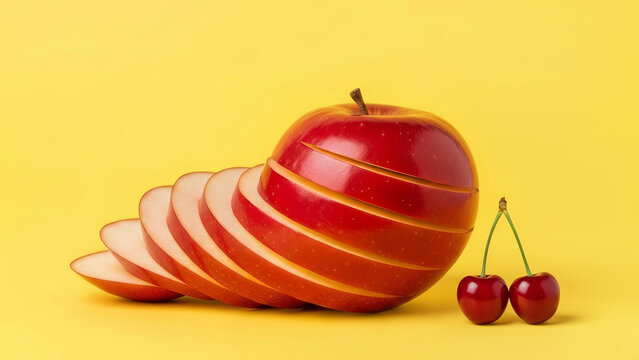 Spiral-Sliced Apple with Cherries on Yellow Background Representing Healthy Eating and Creative Food Presentation