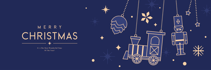 Christmas vector illustration with gold hanging ornaments on blue background. Season's greeting design for banner, poster, cover, greeting card.