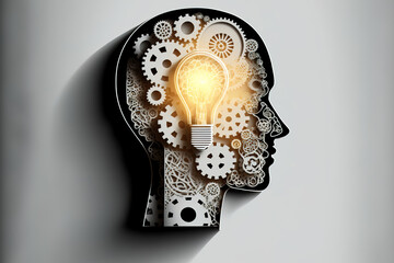 Human head creative idea inspiration, lightbulb and gears inside human head. Generative AI illustration