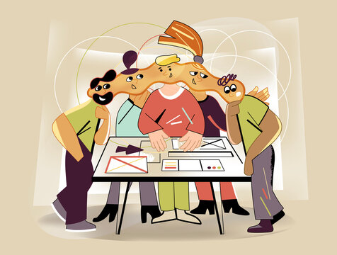 Group of people brainstorming around a table covered with sticky notes and sketches, collaboration, creative business solutions
