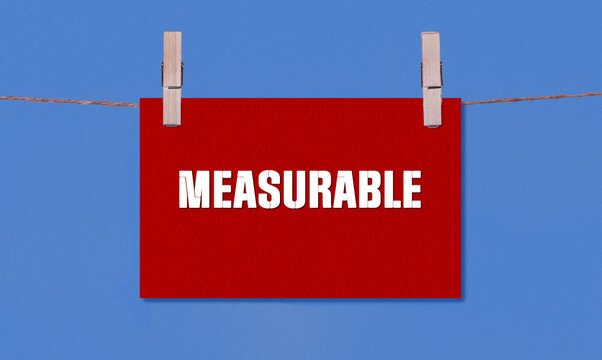 MEASURABLE Symbol. Concept words MEASURABLE on Red Rectangle Paper Hanging on a Wooden Clothespin Blue Background. Business MEASURABLE Concept with Copy Space