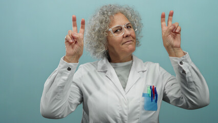 Elderly woman with grey hair making air quotes in a lab coat against a blue wall background, expressing skepticism.