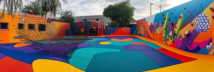 A colorful urban playground with artistic murals on walls creative climbing nets and vibrant foam-padded flooring