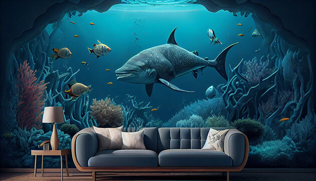 Enter the Enchanting Underwater Realm - Immerse Yourself in the Mesmerizing 3D Effect Wall with Wild Illustration Background. Wall art Decor Wallpaper, Ai generated image